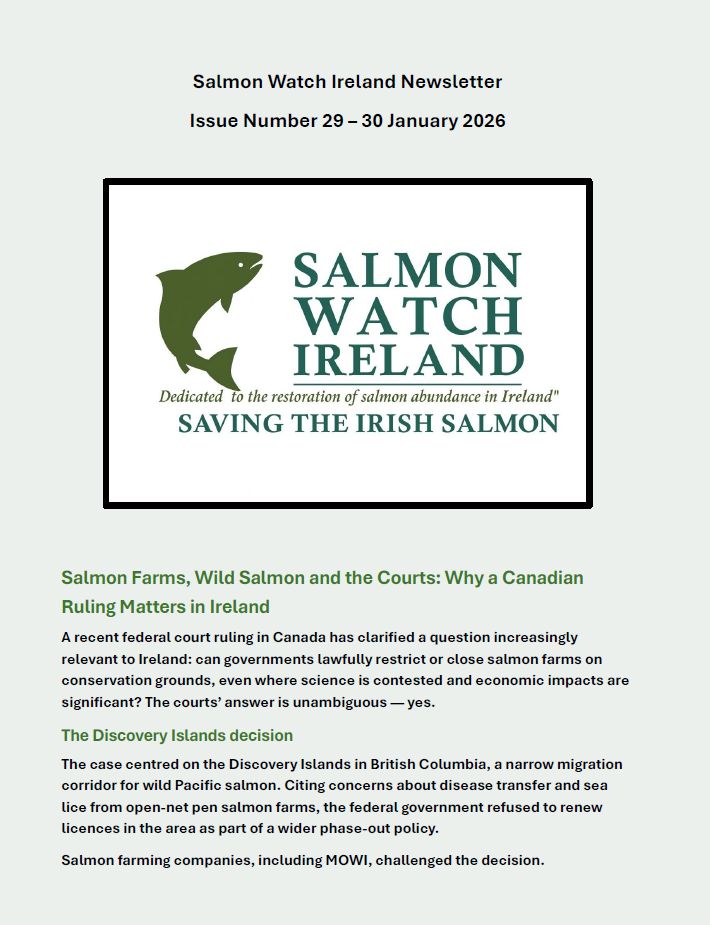 The newsletter opens with an overview of a recent Canadian federal court ruling on salmon aquaculture, which confirmed the right of governments to act decisively and precautionarily in defence of wild salmon, even where such decisions carry significant economic consequences. This case provides a timely and relevant international context for policy and regulatory decisions now facing Ireland.