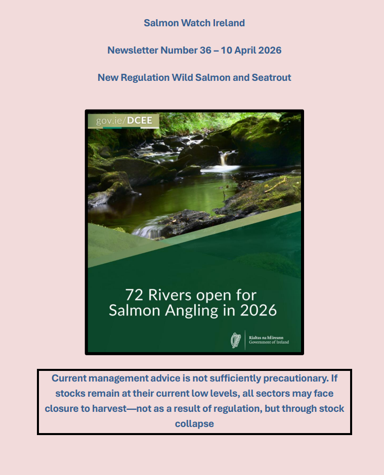 Please find the response of Salmon Watch Ireland to salmon regulations as signed into law in early April. Some positives but overall a disappointing outcome with little concrete advances to protect wild salmon. We ask that all anglers abide by the code of conduct as laid out in the newsletter. We hope for a better outcome for salmon into the future. While the weather presently is not conducive to angling, it is certainly a help in protecting adults returning and smolts will have an abundance of water to safely avoid serious predation pressures. Hopefully these conditions prevail until May.